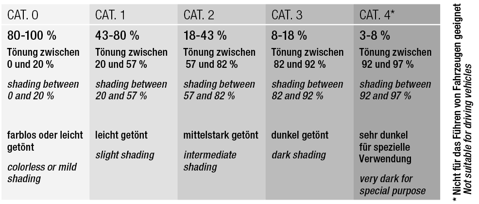 Cat 3: smoke, smoke FM, smoke blue Revo, smoke ice blue Revo, smoke BW Revo, smoke BR Revo, smoke pink Revo, smoke polarized, smoke polarized blue Revo, smoke red Revo, smoke purple Revo, smoke polarized FM, smoke gold Revo, brown rosé Revo, brown orange Revo, brown polarized, brown polarized FM, brown, brown FM, brown gold Revo, brown red Revo, green green Revo, green orange Revo, green BR Revo, green polarized green Revo, green polarized purple Revo, green purple Revo, green/grey, high contrast